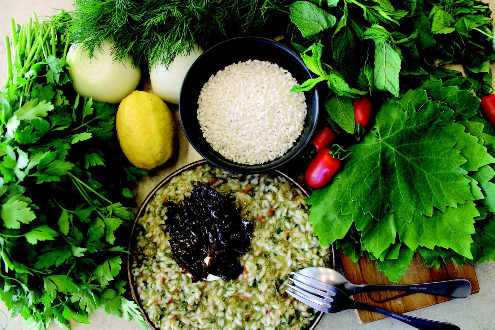 Τα φύλλα της αμπέλου είναι ένα δημοφιλές και βασικό στοιχείο της υγιεινής μεσογειακής κουζίνας. Έχουν πολύ λίγες θερμίδες αλλά πολλά θρεπτικά συστατικά. Είναι πλούσια σε φυτικές ίνες, αντιοξειδωτικά, βιταμίνες Α και Κ, μαγνήσιο, ασβέστιο. Έτσι, θωρακίζουν τον οργανισμό από διάφορες ασθένειες, μειώνουν φλεγμονές, βελτιώνουν την πέψη, την όραση, τη λειτουργία της καρδιάς, κάνουν καλό στις αρθρώσεις. Οι Έλληνες ένα πράγμα σκεφτόμαστε όταν ακούμε αμπελόφυλλα: ντολμαδάκια! Προέρχονται ετυμολογικά από τη λέξη dolmak, που σημαίνει «παραγεμισμένα». Κατάγονται από τη Μικρά Ασία αλλά το εντυπωσιακό είναι πως η πρώτη καταγεγραμμένη αναφορά στον ντολμά βρίσκεται στο δυτικό αέτωμα του Παρθενώνα, όπου η θεά Ήρα απεικονίζεται να τρώει κρυφά ντολμαδάκια από την κατσαρόλα, ενώ κοιτάζει πίσω της μη τη δει κανείς. Τα ντολμαδάκια είναι ένας νόστιμος μεζές που πάει με όλα τα φαγητά που μπορεί να έχουμε σ’ ένα τραπέζι. Πάντως, και μόνα τους αποτελούν ένα απολαυστικό και υγιεινό κυρίως πιάτο. Εδώ, ο chef μας Μανώλης Παπουτσάκης, προτείνει μια εναλλακτική, αλλά εξίσου νόστιμη εκδοχή τους που μοιάζει με ριζότο και που σίγουρα θα εντυπωσιάσει τους καλεσμένους σας!