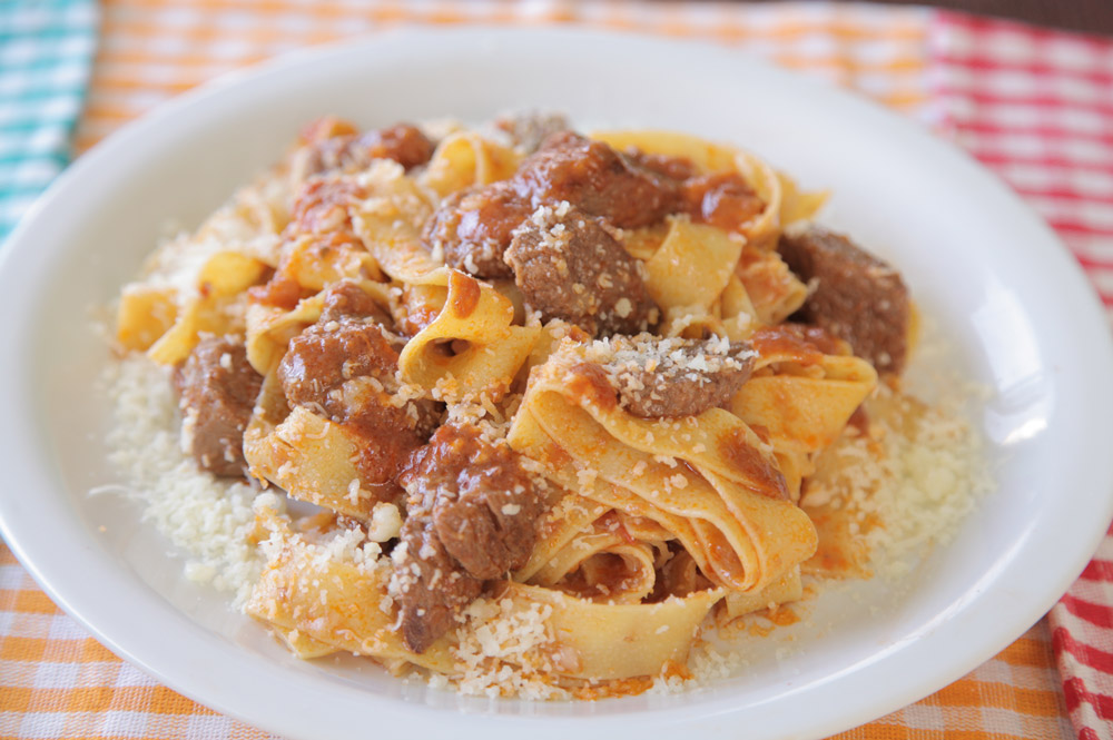 Για τις παπαρδέλες βράζουμε αλατισμένο νερό ή ζωμό μοσχαρίσιο και ακολουθούμε τις οδηγίες της συσκευασίας. Όταν είναι και τα δύο έτοιμα, ενώνουμε τα ζυμαρικά με το κρέας και την σάλτσα ρίχνοντάς το βούτυρο και πασπαλίζουμε με γραβιέρα Κρήτης.