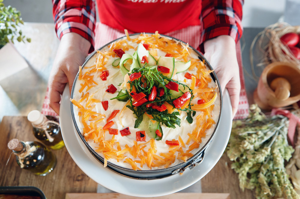 Και αρχίζουμε το στήσιμο παίρνουμε ένα τσέρκι στρογγυλό. Αλατοπιπερώνουμε λαδώνουμε και βάζουμε λεμόνι στο σταμναγκάθι μας, το οποίο βάζουμε σαν πρώτη στρώση. Βάζουμε αλάτι, πιπέρι, τα κρεμυδάκια, τη μαγιονέζα στις πατάτες μας και στρώνουμε τη δεύτερη στρώση. Από πάνω βάζουμε το καρότο που το αλατοπιπερώνουμε, στη συνέχεια τις πιπεριές Φλωρίνης, τα αγγουράκια και κάνουμε μία στρώση από το ασπράδι του αβγού που το έχουμε περάσει στο μπλέντερ μαζί με το τυρί κρέμα, αλάτι και πιπέρι. Πάνω πάνω στολίζουμε με τον κρόκο του αυγού, λίγο τριμμένο αγγούρι,λίγο τριμμένο καρότο και λίγη πιπεριά Φλωρίνης.