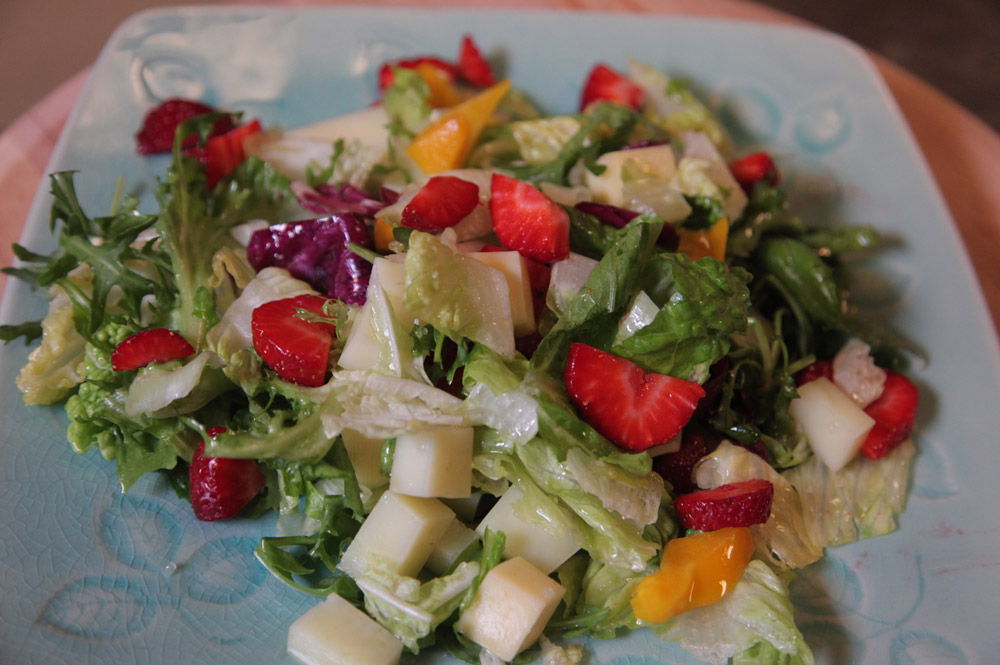 Κόβουμε τα λαχανικά με το χέρι και στύβουμε το πορτοκάλι μέσα στις φράουλες.