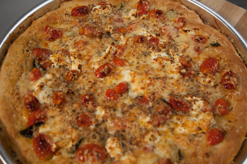Τη βάζουμε να ψηθεί, μέχρι να σταθεροποιηθεί ο χυλός και να πάρει την όψη μισοψημένου ζυμαριού. Μόλις σταθεροποιηθεί η ζύμη τη βγάζουμε από το φούρνο και απλώνουμε πάνω της τη γέμιση, πρώτα τα ντοματίνια, μετά τα τυριά και τη ρίγανη και στο τέλος το ελαιόλαδο και ψήνουμε ξανά στον φούρνο μέχρι να λιώσουν τα τυριά μας και να αποκτήσει η πίτσα ρόδινο χρώμα.